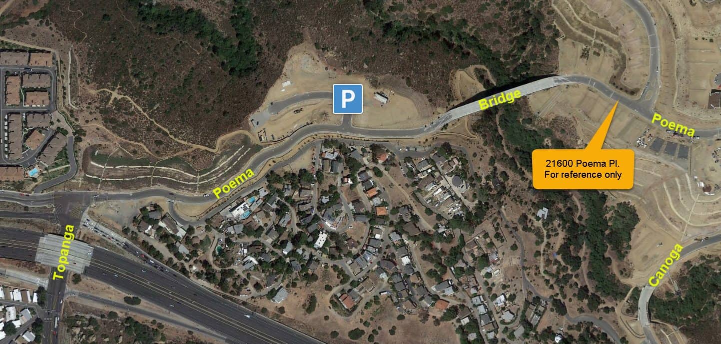 🚙From Topanga Cyn Blvd – go north on Topanga past the 118. Turn right on Poema Pl, but don’t go all the way to 21600. Before the bridge turn left into Crestley/Landsea Homes construction site. Park in cul de sac on right.