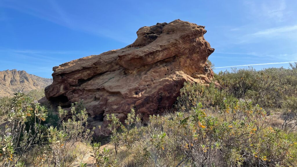 The Chumash Trail showcases the unique geological timeline of the area with striking rock formations and hilly landscapes. Siltstone and sandstone reveals transformations over millions of years. Fossils of ocean invertebrates and vertebrates found along the trail are evidence of a time when the local hills were underwater. The Simi-Santa Rosa fault crosses the ridge near the intersection of the Chumash-Rocky Peak trails.