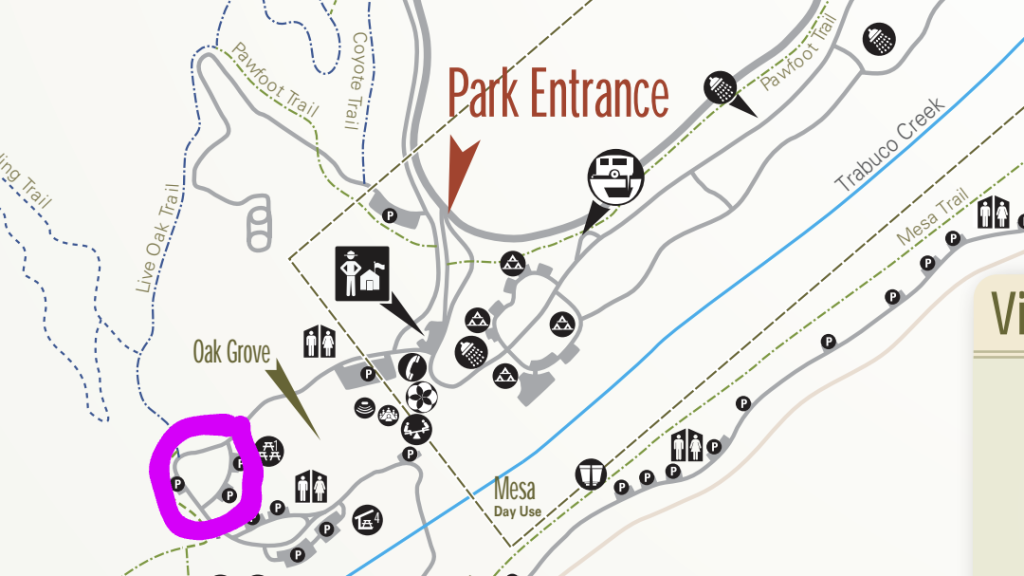 Here is a link to the park map: https://www.ocparks.com/sites/ocparks/files/2021-04/O%27Neill%20Regional%20Park%20Map.pdf