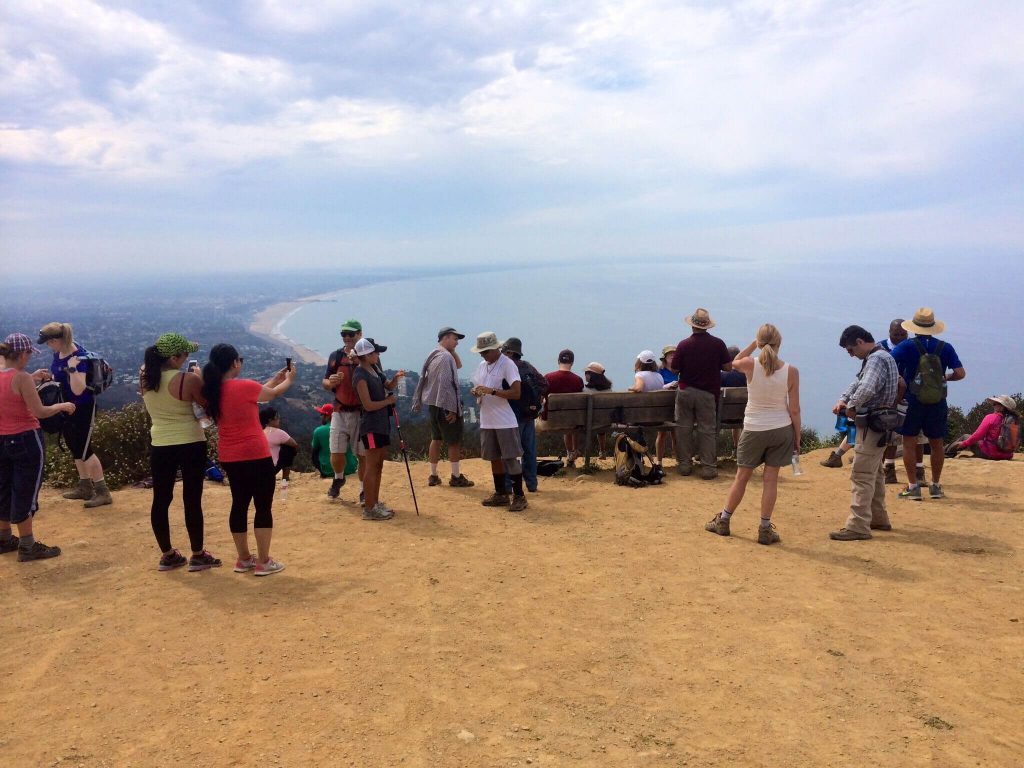At the top, on the Parker Mesa Overlook, there are a couple of benches where we can enjoy one of the most spectacular views of the Los Angeles coastline and a snack. We’ll take an extended break here to allow everyone to catch up